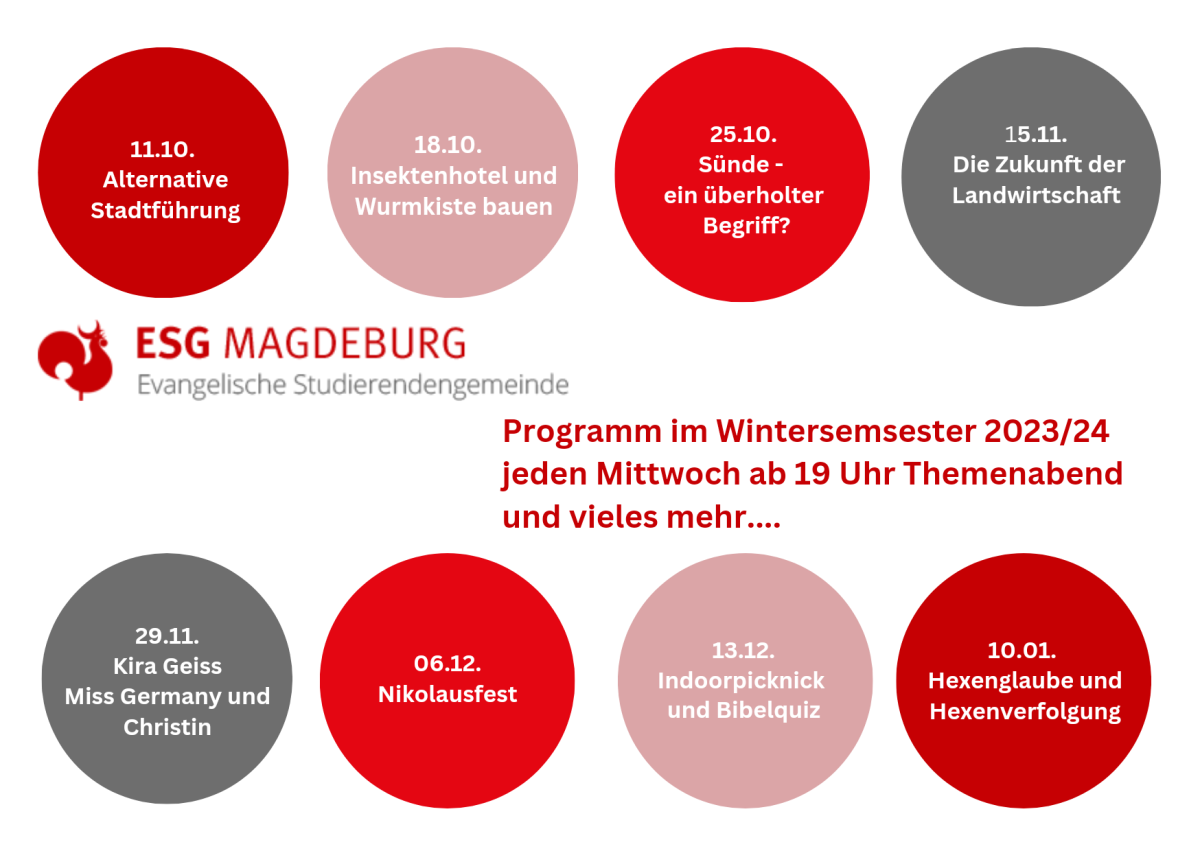 Der ökumenische Semestereröffnungsgottesdienst war ein schöner gemeinsamer Auftakt - ein besonderer Schwerpunkt lag auf der musikalischen Gestaltung: Laureen hat drei Stücke auf der Harfe gespielt, die Blechbläser der ESG, Buntmetall und Sandra Schilling an der Orgel haben jeweils drei Lieder begleitet. In der Predigt ging es um die Forderung eines reichen Mannes an Jesus, das ewige Leben zu erben (Markus 10). Im Anschluss gab es ein gemeinsames 3 Gänge - Essen in den Räumen der KSG.