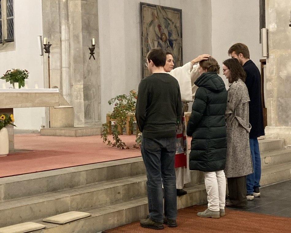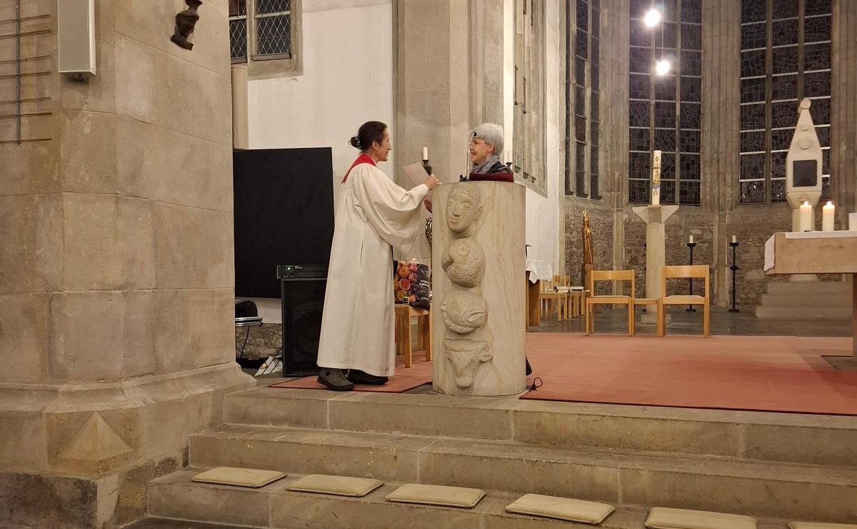 Da in dem Gottesdienst auch Kirchenrätin Katharina Passolt der evangelischen Studierendenpfarrerin die Urkunde zur Entsendung auf die ESG-Stelle für weitere 6 Jahre überreichte, verbunden mit sehr herzlichen Worten, waren auch Gäste aus anderen Gemeinden und Religionsgemeinschaften gekommen. In der Predigt von Angela Kunze-Beiküfner ging es darum, ob Gebete die Welt verändern können – und die Predigerin berichtete von ihren Erfahrungen in der Berliner Gethsemanekirche 36 Jahre zuvor am 9. Oktober 1989. Pater Clemens und die KSG luden im Anschluss alle zur Weißwurst und zu Brezeln ein. Es gab aber auch vegetarische Alternativen….